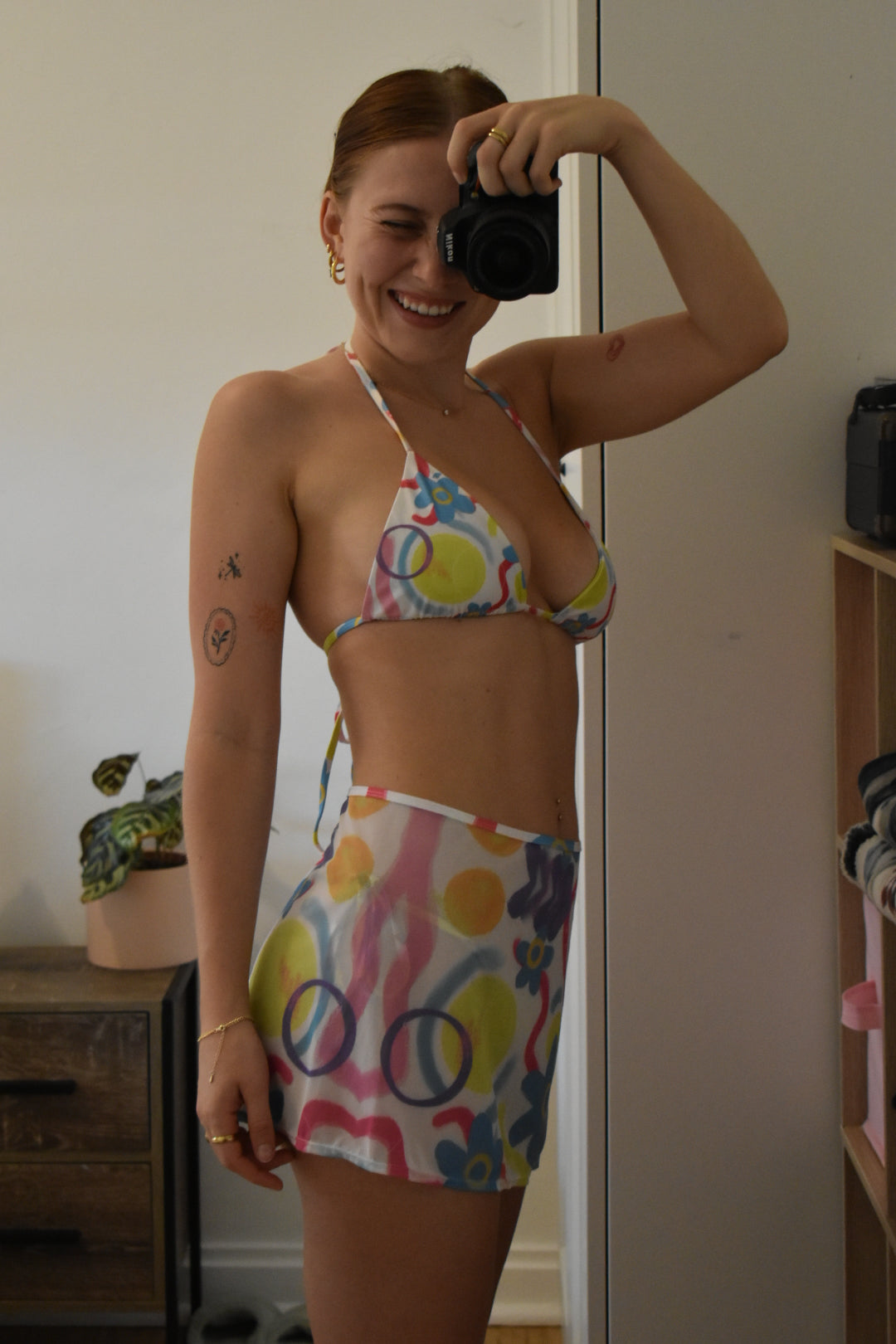Creator Gracie wearing the Classic Triangle Top and Swim Skirt in our fun-loving 'Bloom' pattern